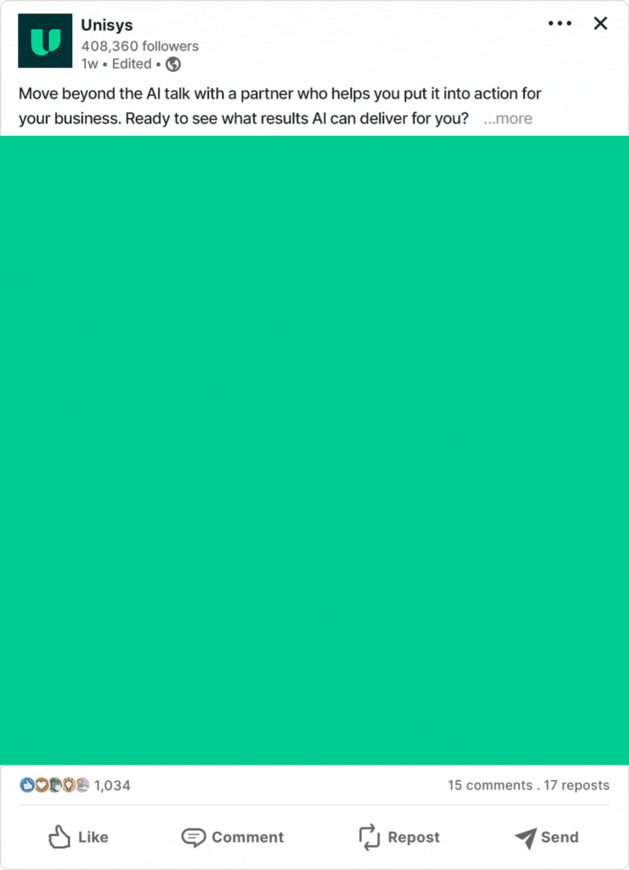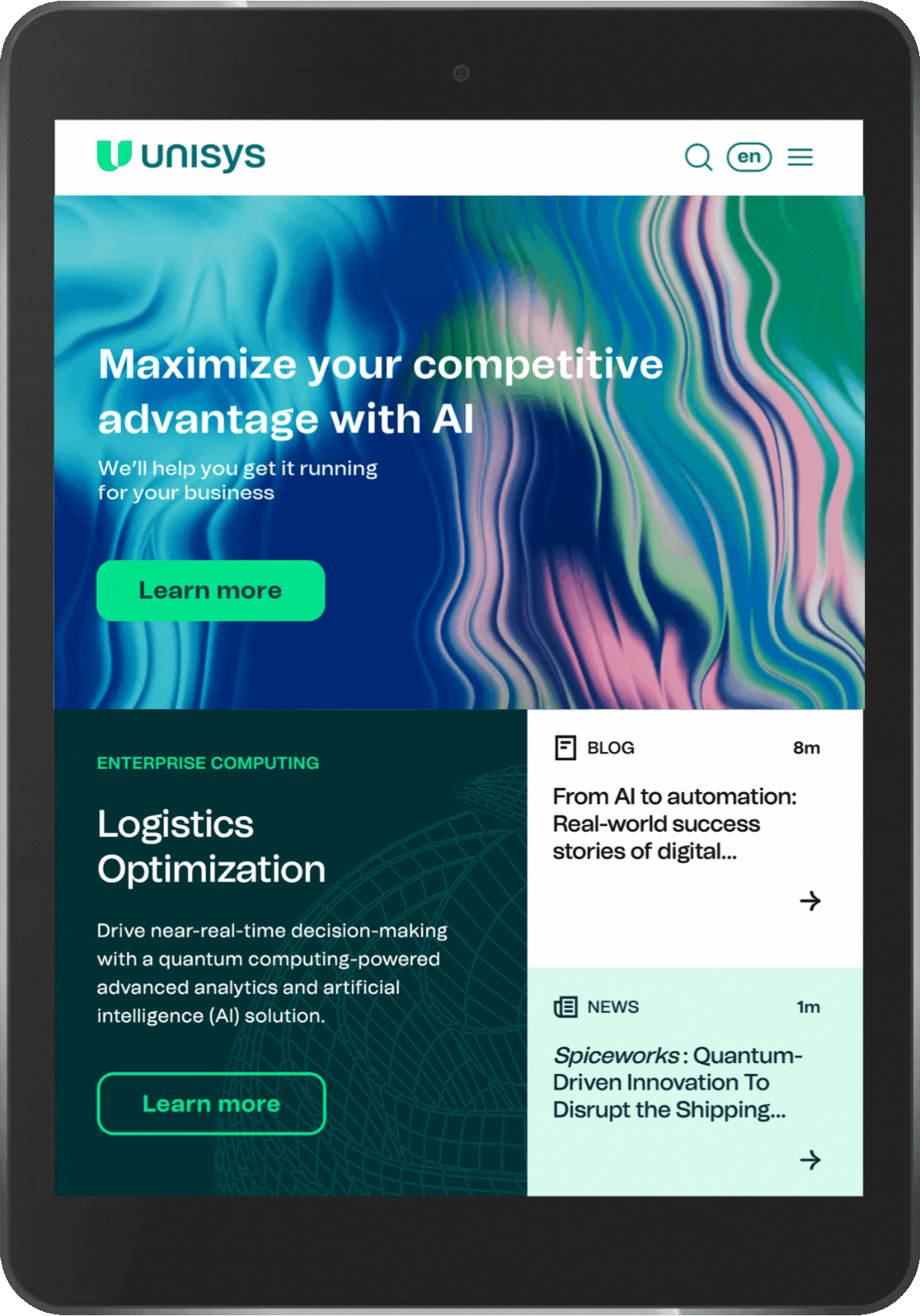 Developed to promote Unisys AI Solutions, this campaign highlights the brand’s innovative edge. A refreshed visual system was applied across digital and print, combining bold gradients, fluid shapes, and modern layouts drawing from the brand’s shape language. The style conveys precision, speed, and competitive intrigue.